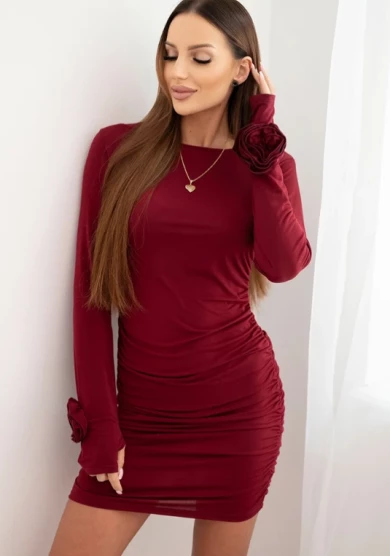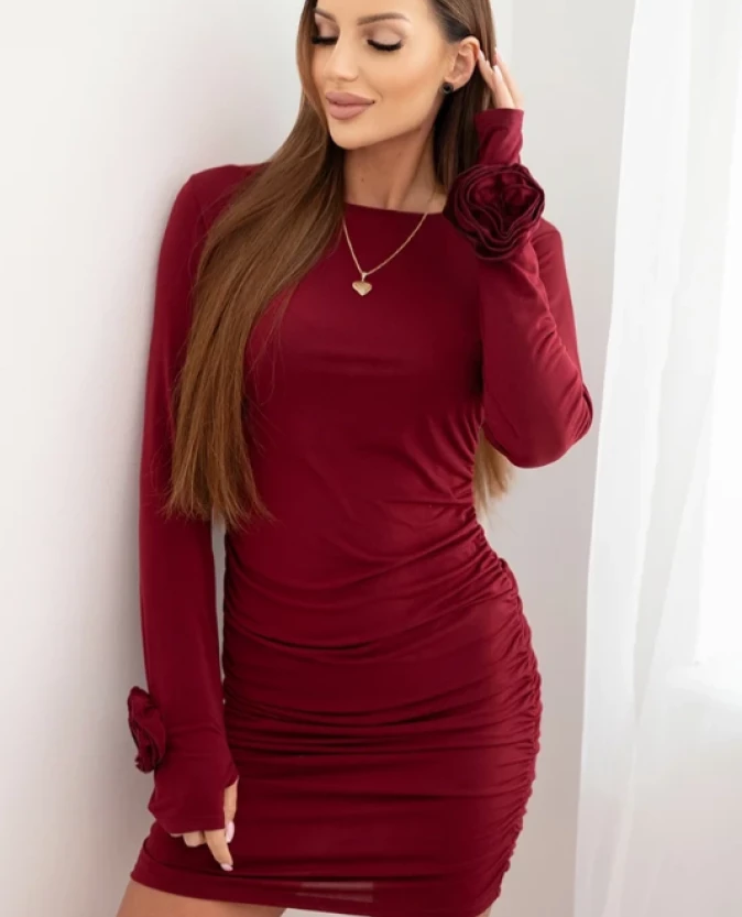 Bordowa sukienka mini to elegancka propozycja pełna kobiecego wdzięku. Dopasowany fason subtelnie podkreśla sylwetkę, a długie rękawy z kwiatowymi aplikacjami oraz efektowne marszczenie na całej długości nadają sukience wyjątkowego charakteru.