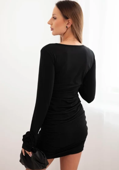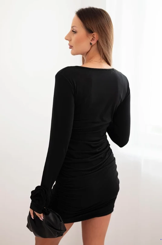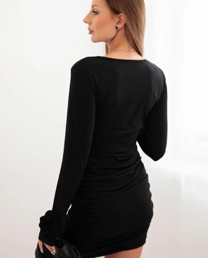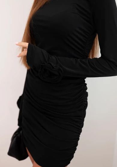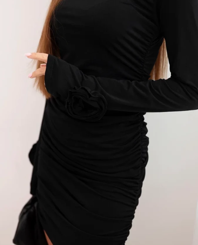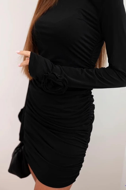 Czarna sukienka mini łączy klasyczną elegancję z kobiecym urokiem. Dopasowany fason podkreśla sylwetkę, a efektowne marszczenie na całej długości i kwiatowe aplikacje na mankietach dodają sukience stylowego i wyrafinowanego charakteru.