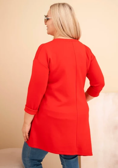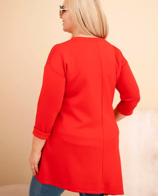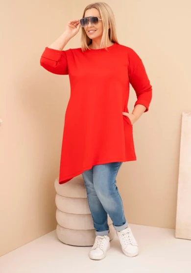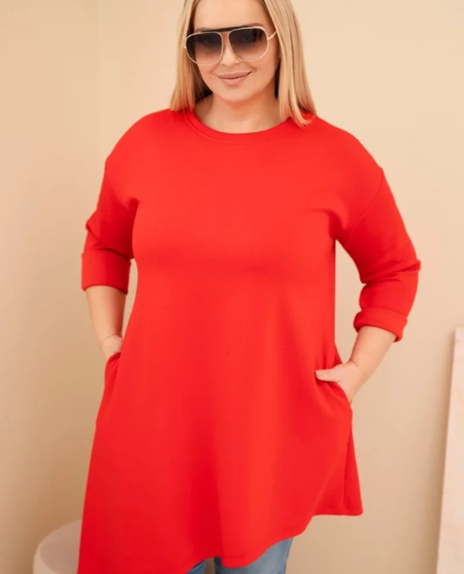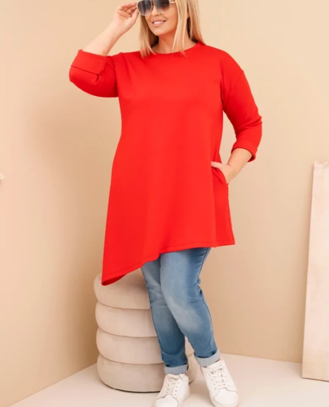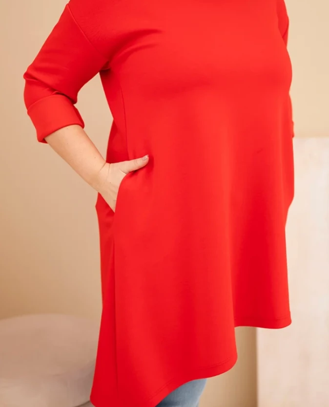 Wyrazista sukienka z wiskozy w czerwonym odcieniu to idealna propozycja dla kobiet, które lubią łączyć komfort z mocniejszym akcentem kolorystycznym. Miękki, elastyczny materiał pięknie dopasowuje się do sylwetki, a swobodny fason zapewnia wygodę przez cały dzień. Asymetryczny dół nadaje jej modnego, dynamicznego charakteru.
