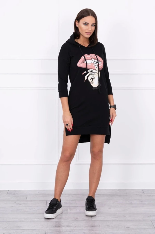 Sukienka z dłuższym tyłem i kolorowym nadrukiem czarna