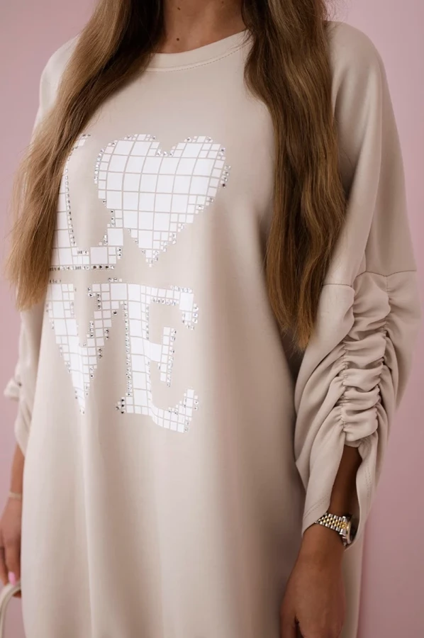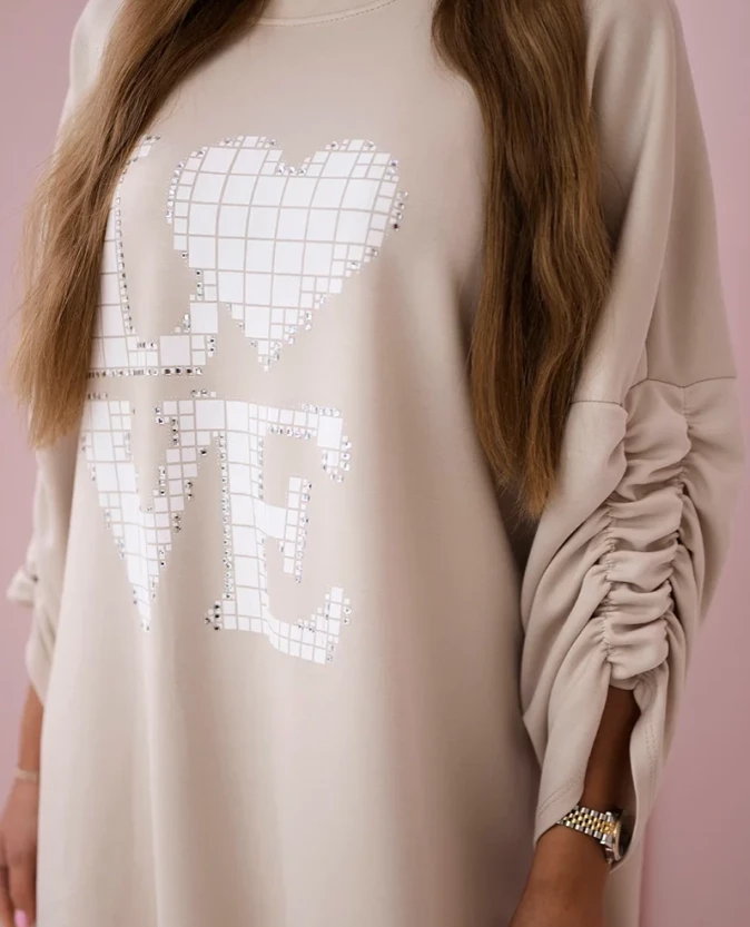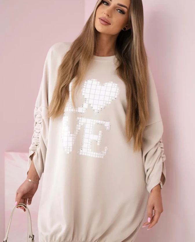 Sukienka z dłuższym tyłem i nadrukiem to połączenie wygody i stylu w nowoczesnym wydaniu. Dzięki wysokiej jakości materiałowi doskonale trzyma fason, podkreślając kobiecą sylwetkę. Jej asymetryczny krój z dłuższym tyłem nadaje niepowtarzalnego charakteru, a nadruk "Love" wprowadza subtelny, modny akcent. Marszczenie na rękawkach dodaje elegancji i delikatności, czyniąc sukienkę idealnym wyborem zarówno na co dzień, jak i na wyjątkowe okazje. To propozycja, która zachwyci nie tylko funkcjonalnością, ale także oryginalnym designem. Uniwersalny rozmiar sprawia, że pasuje do kobiet noszących rozmiary S, M lub L, co czyni ją wszechstronnym elementem każdej garderoby.