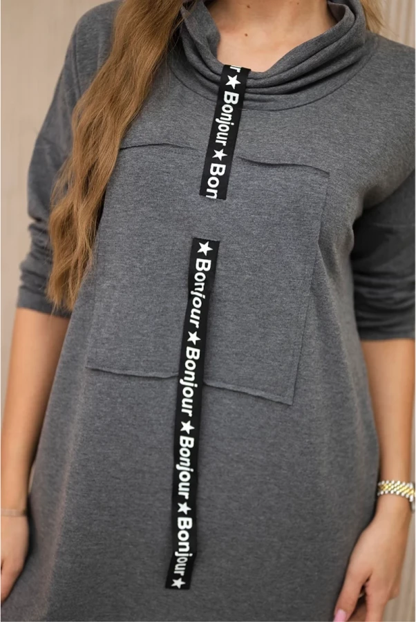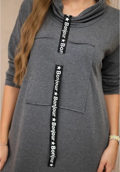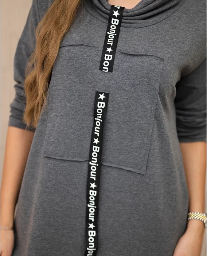 Sukienka posiada taśmę imitującą krawat, po bokach wszyte dwie praktyczne kieszenie.