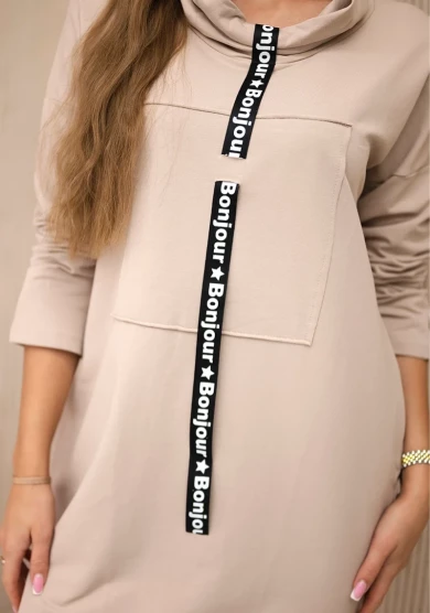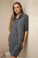 Sukienka posiada taśmę imitującą krawat, po bokach wszyte dwie praktyczne kieszenie.