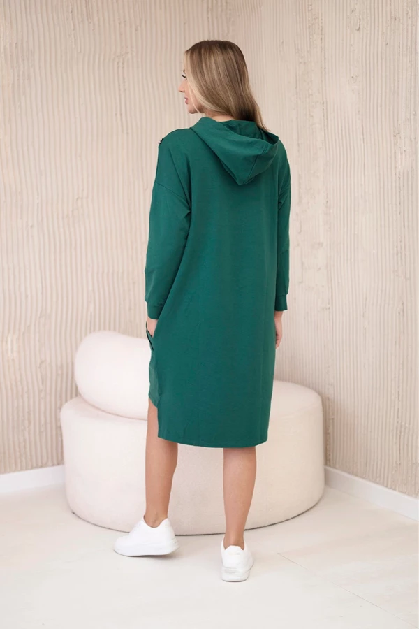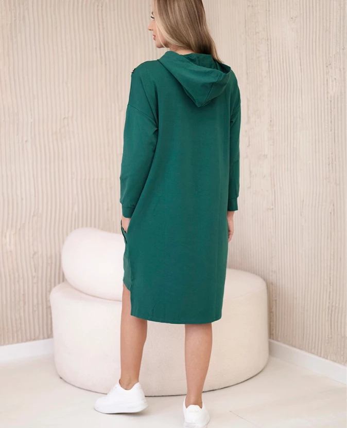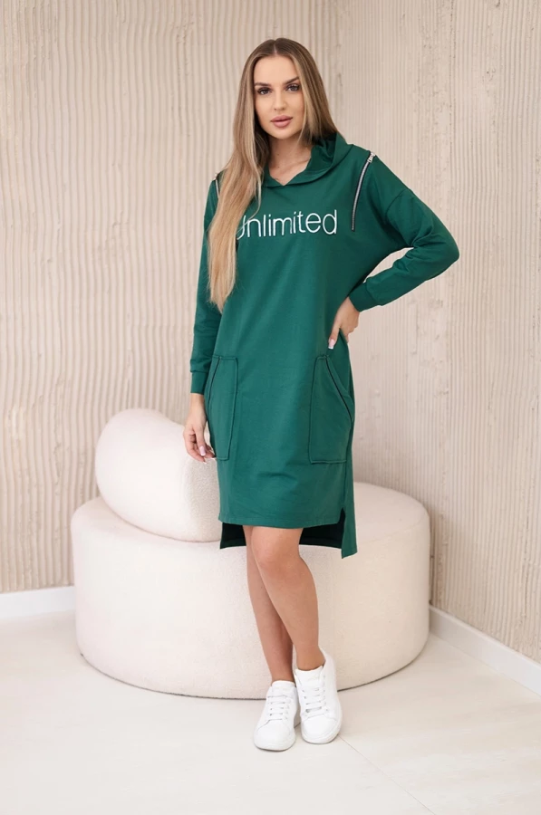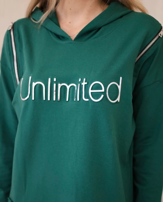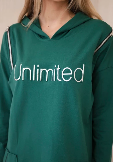 Prezentujemy modną sukienkę. Sukienka posiada napis unlimited. Na górze sukienki znajdują się pionowe suwaki. Sukienka z dłuższym tyłem i kapturem. Sukienka z naszytymi kieszeniami. Idealna pozycja na co dzień. Sukienka wykonana jest z wysokiej jakości materiału.