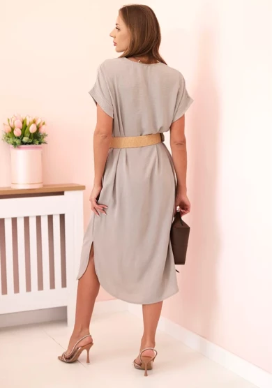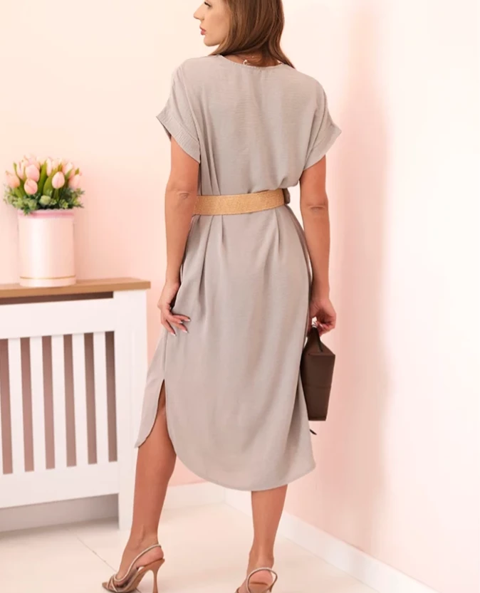 Sukienka z Ozdobnym Paskiem i Rozcięciami – Cappuccino