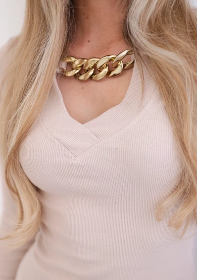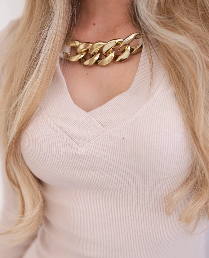 Beżowa dopasowana sukienka ze złotym łańcuchem – subtelna elegancja i kobiecy szyk