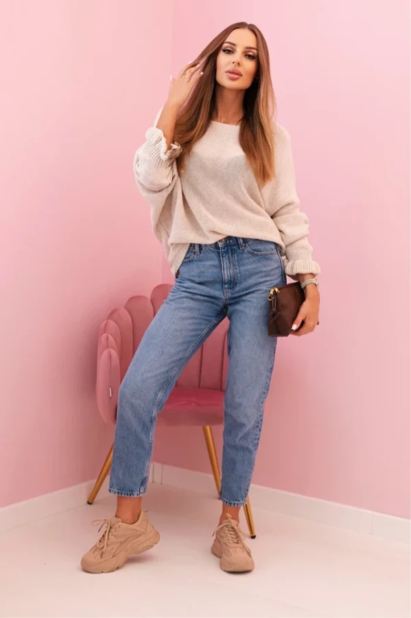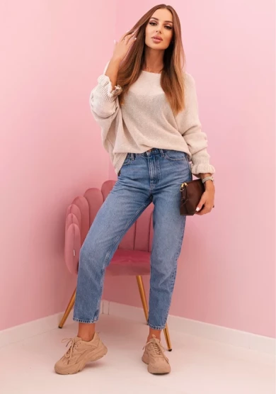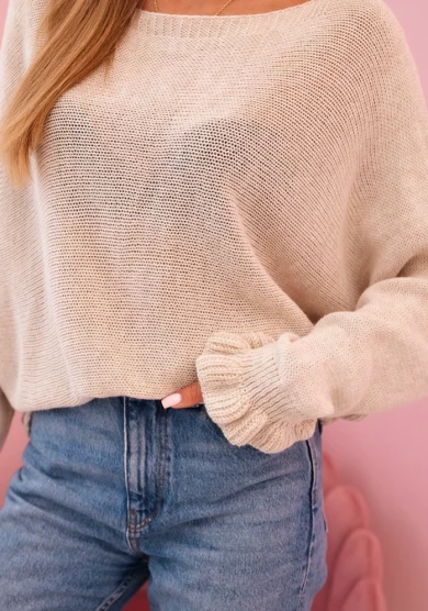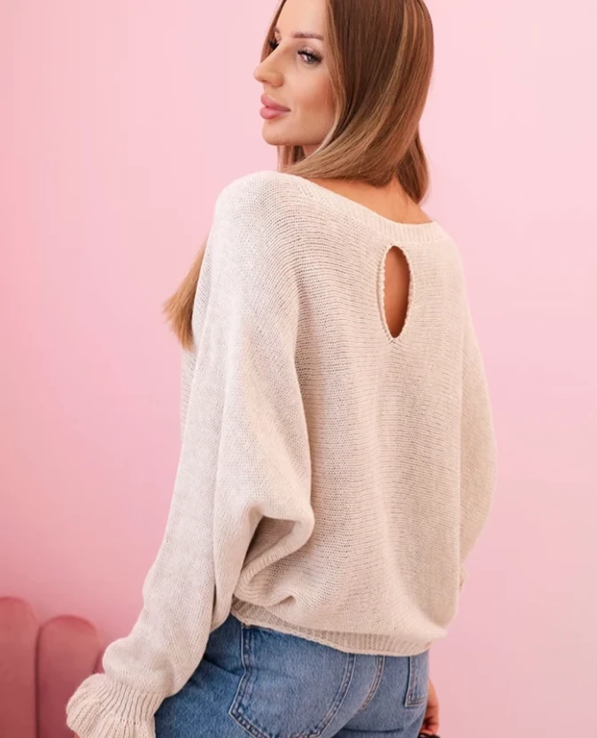 Sweter damski luźny z ozdobnym wycięciem – Beżowy