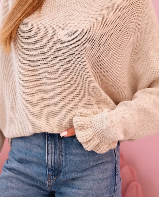 Sweter damski z moheru z marszczonymi rękawami i wycięciem na plecach Beżowy