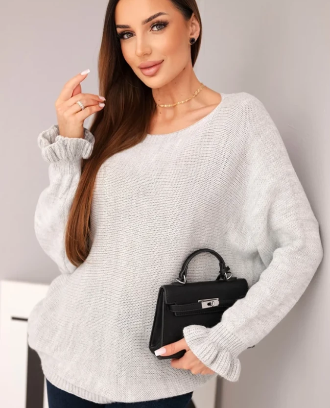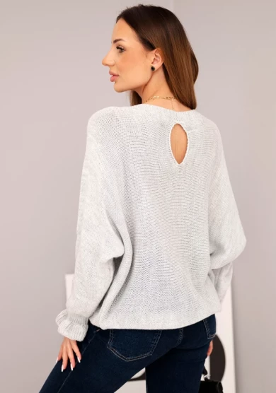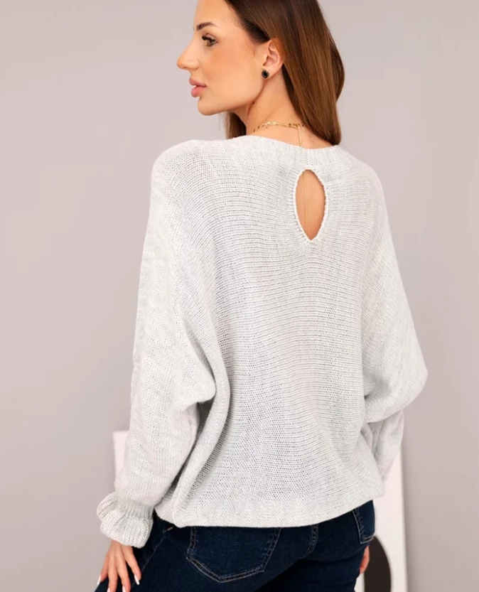 Sweter damski luźny z ozdobnym wycięciem – Jasny Szary