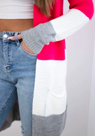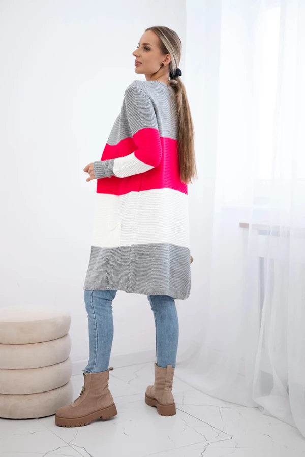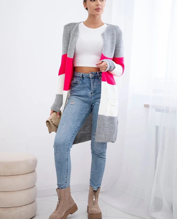Długi sweter damski w szerokie pasy – szary + malinowy