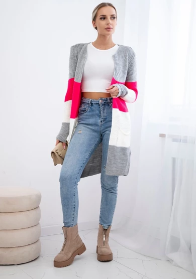 Sweter Kardigan w pasy Szaro Malinowy