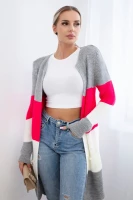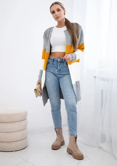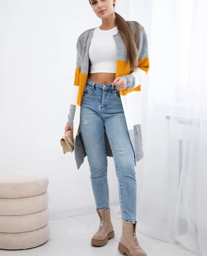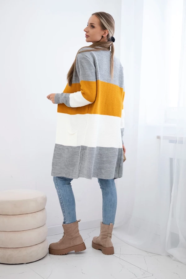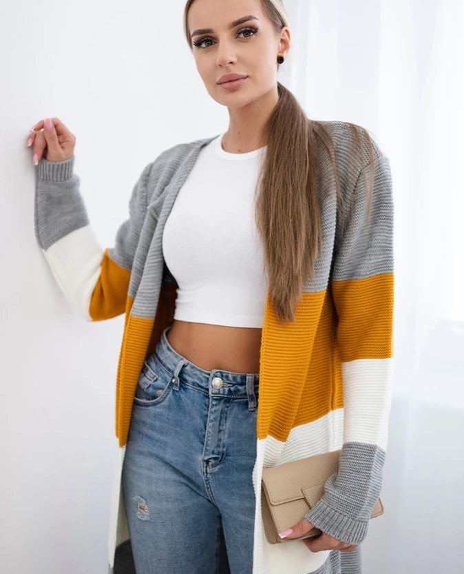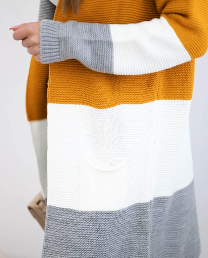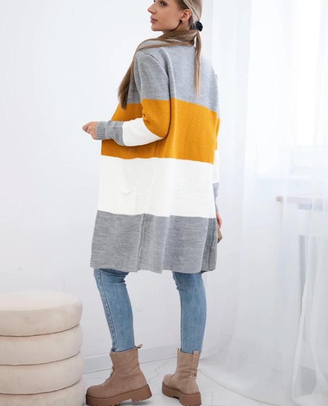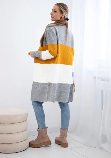 Długi sweter damski w szerokie pasy – szary + musztardowy