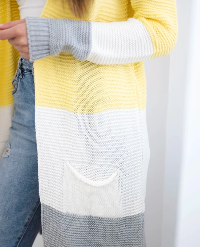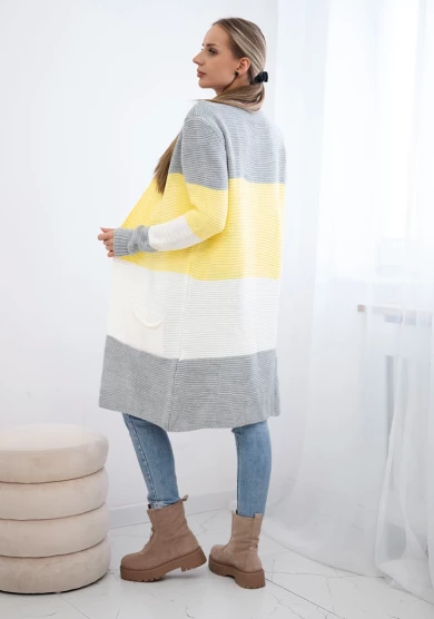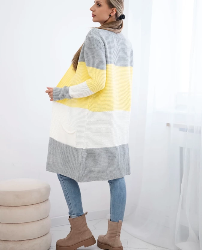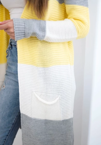 Długi sweter damski w szerokie pasy – żółty + szary